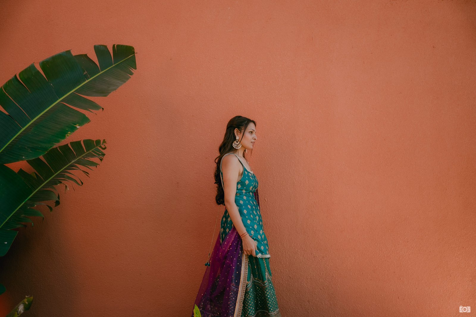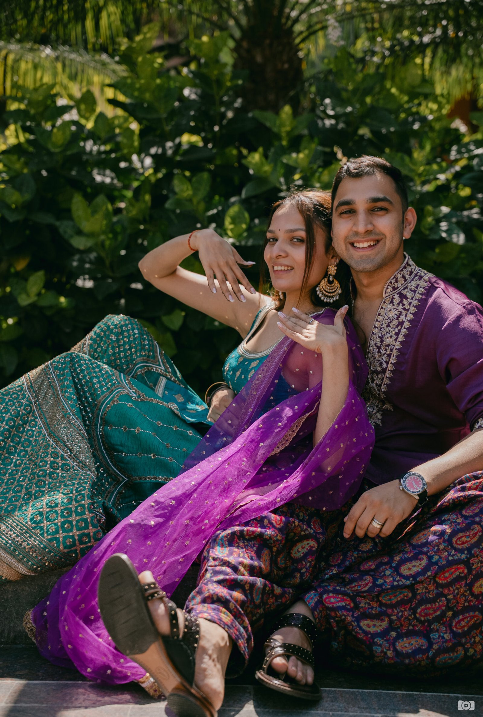 For our co-founder, Stuti, we designed a striking teal and purple gharara set, featuring a kurti with intricate zardozi handwork and wide-leg palazzo pants along with a rich purple dupatta for an elegant look.