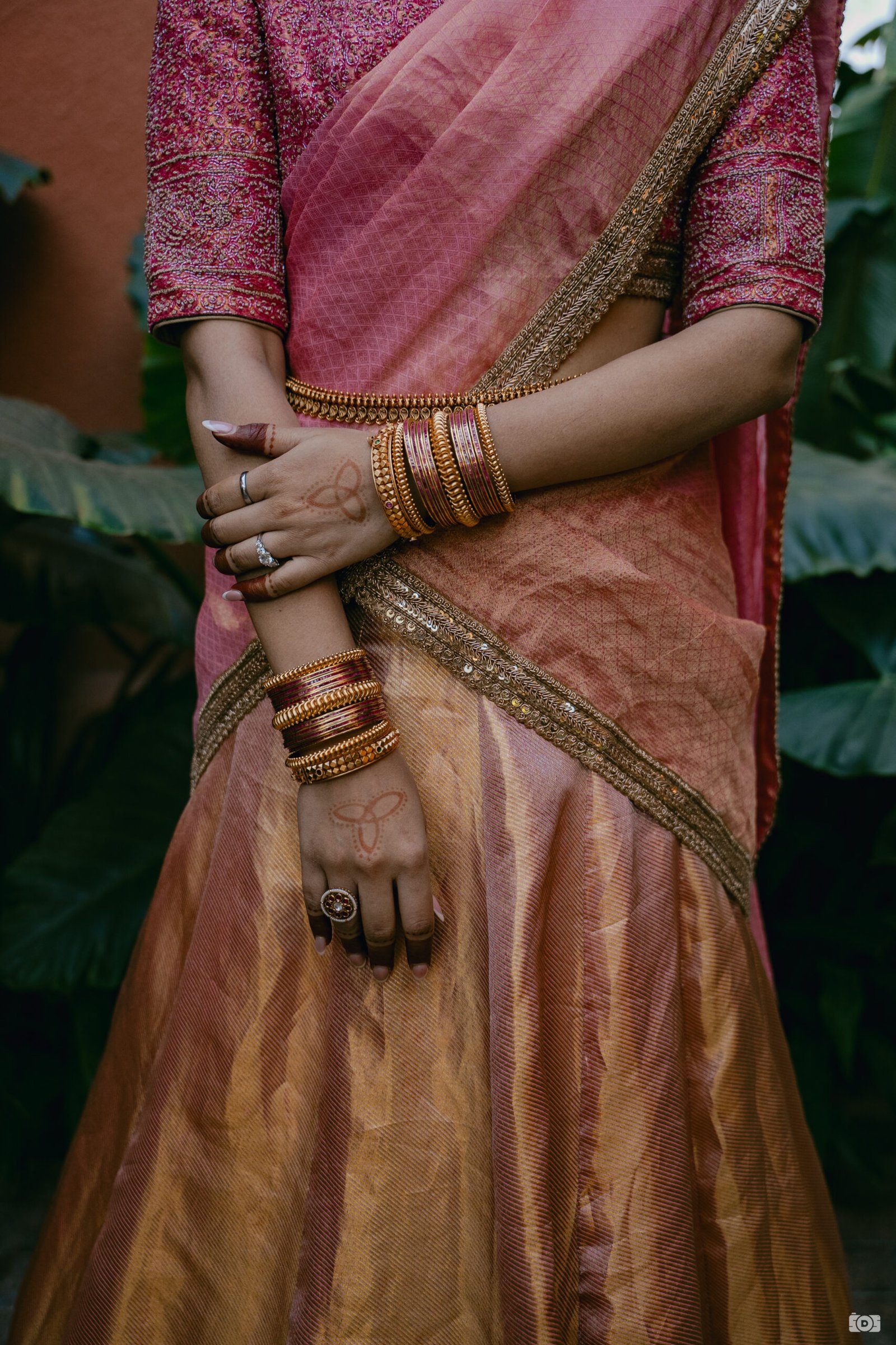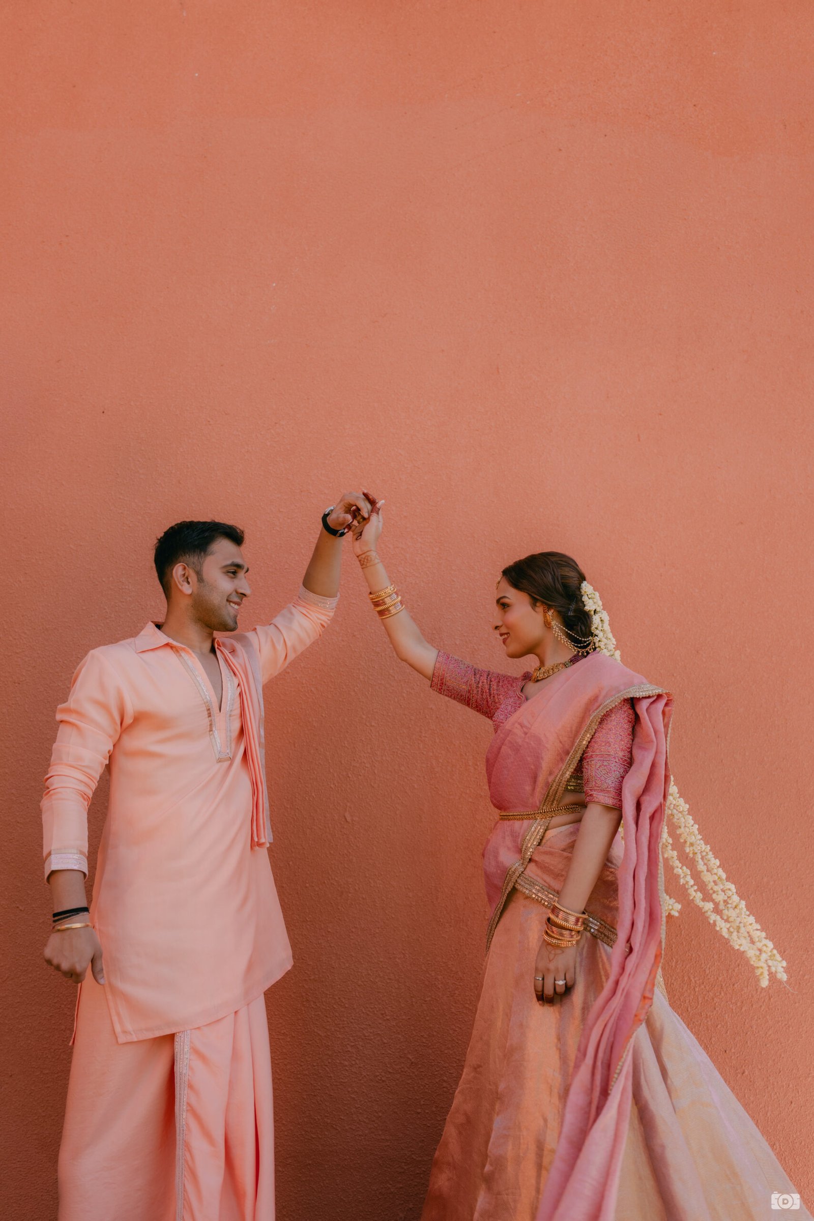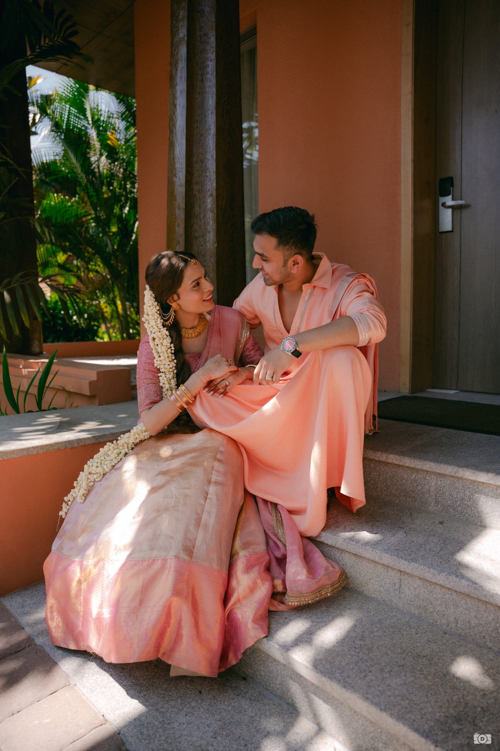 A traditional half-saree ensemble for our co-founder’s South Indian haldi, crafted in a peach Kanjivaram weave and paired with an intricately embroidered blouse. It beautifully brings together timeless elegance and festive allure.