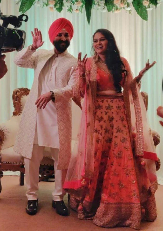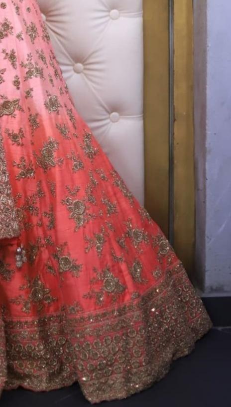 Our client came to us looking for a fresh and upbeat look for her engagement, to kickstart her wedding festivities. Keeping in mind her personality and preferences, we curated this gorgeous banarasi ombre lehenga in hues of orange and pink highlighted with zardozi craftsmanship. We paired the lehenga with a net dupatta to complete the look.