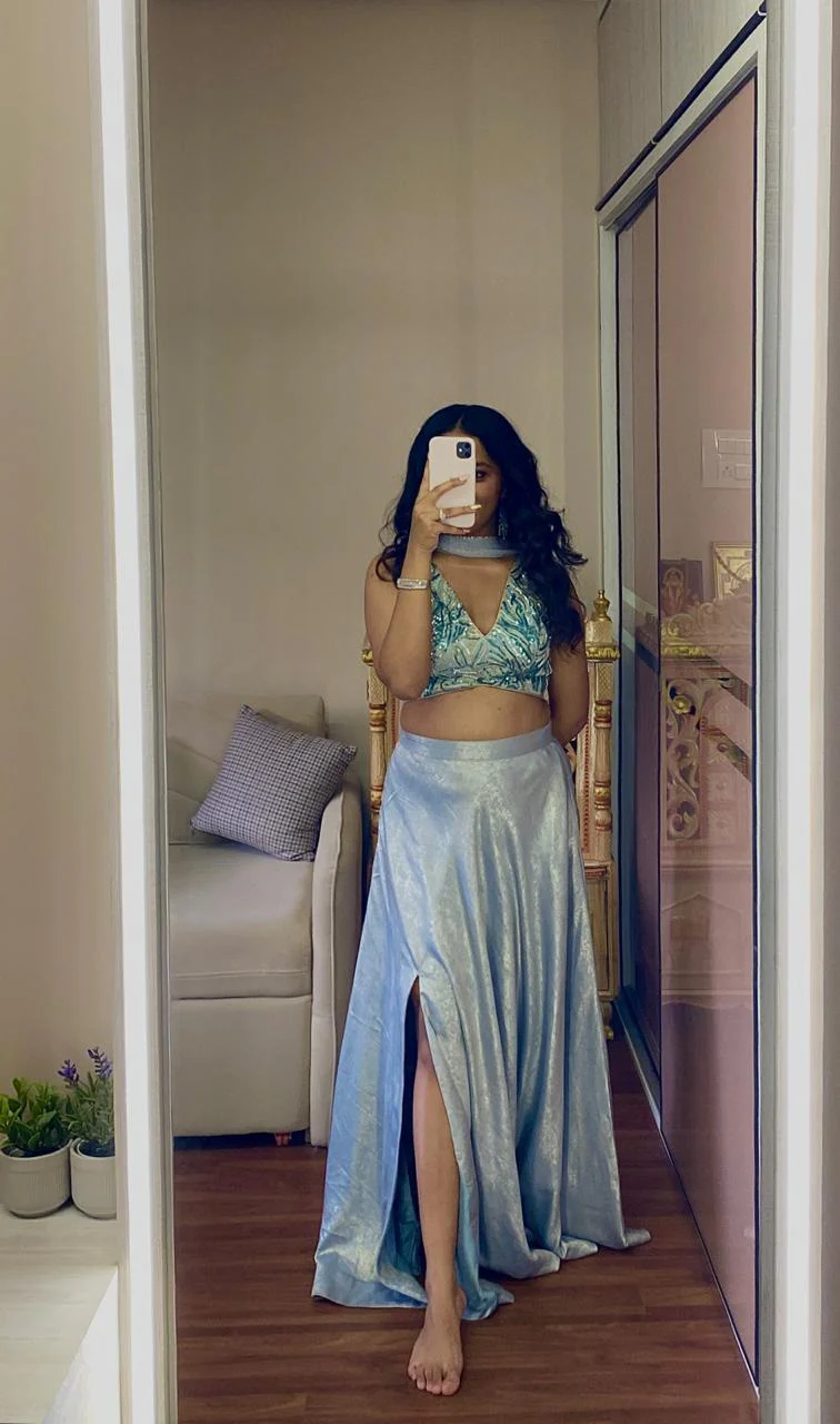 We curated this beautiful indo-western look for our client for a sangeet function. We created a long slitted skirt, and paired it with a hand-embroidered chevron blouse to uplift the look.