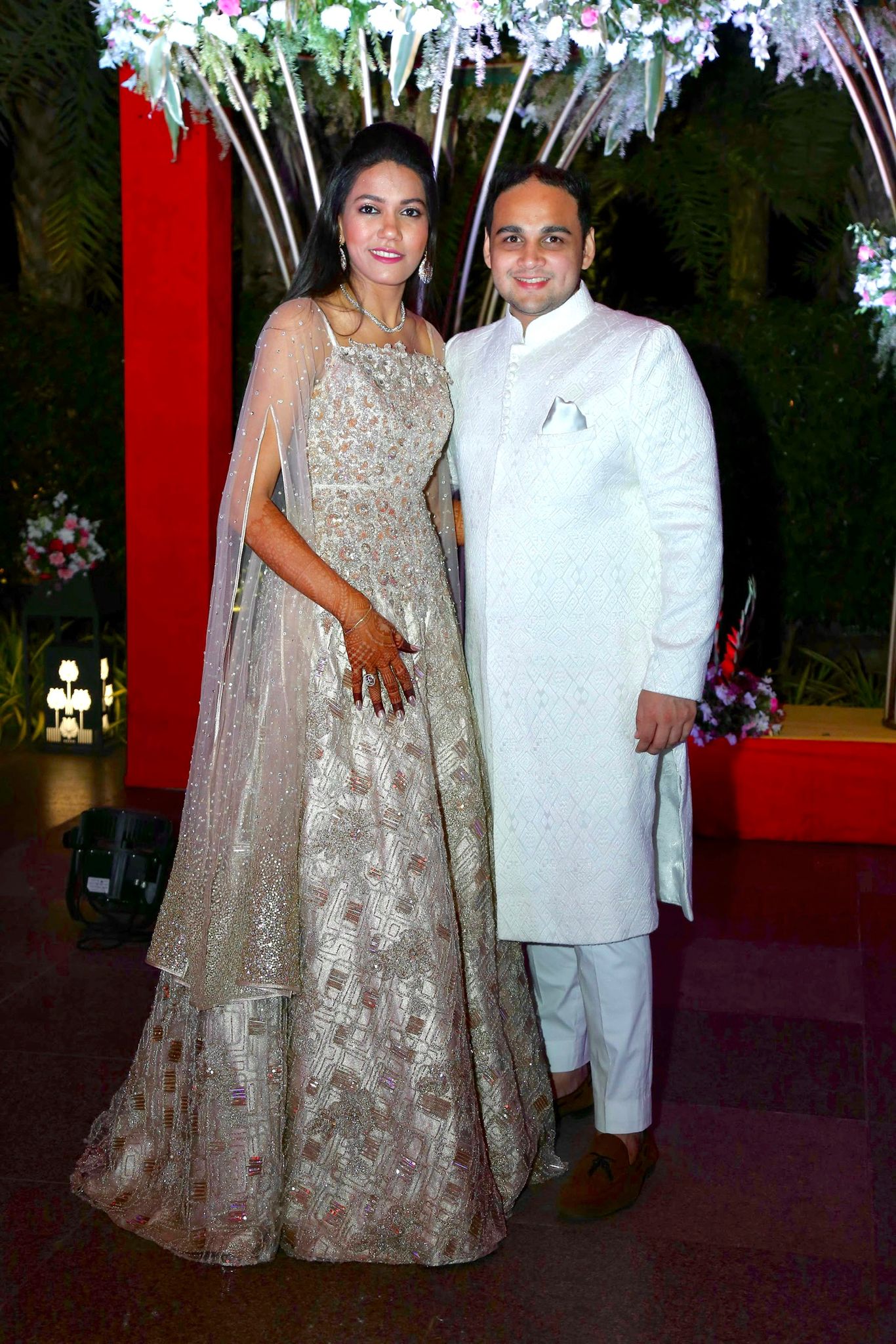 Our bride wanted a comfortable yet a glamourous outfit for her reception ceremony. We created this stunning hand-embellished gown in a stylish cut with long sleeves, in a classic champagne colour to match her choices.