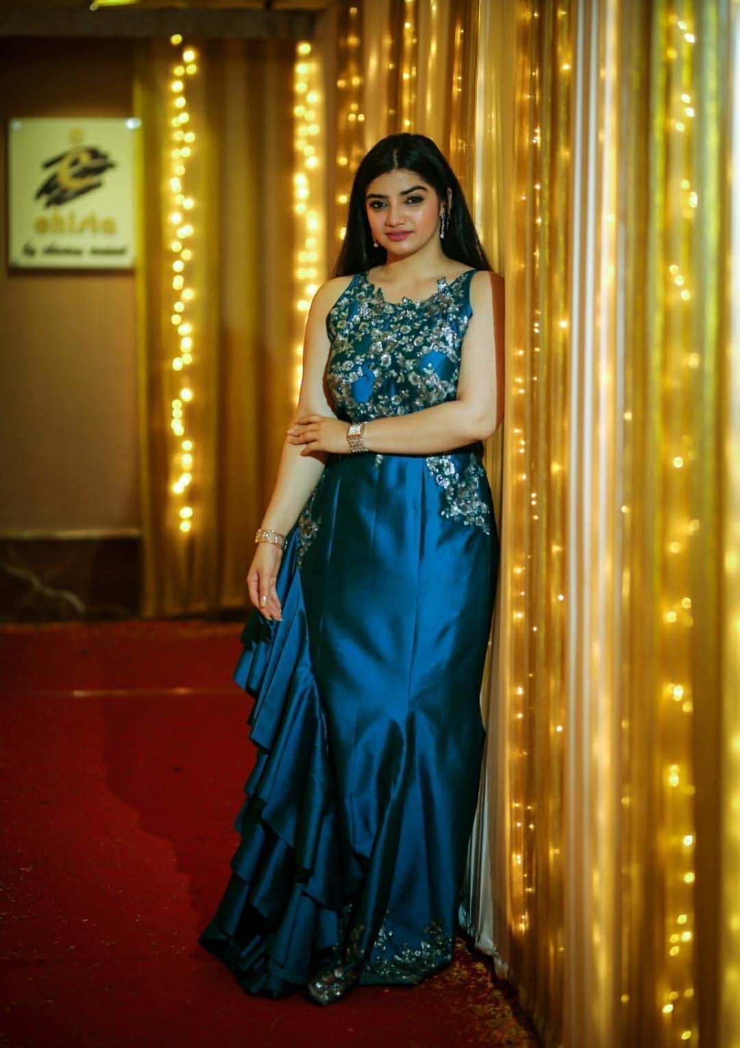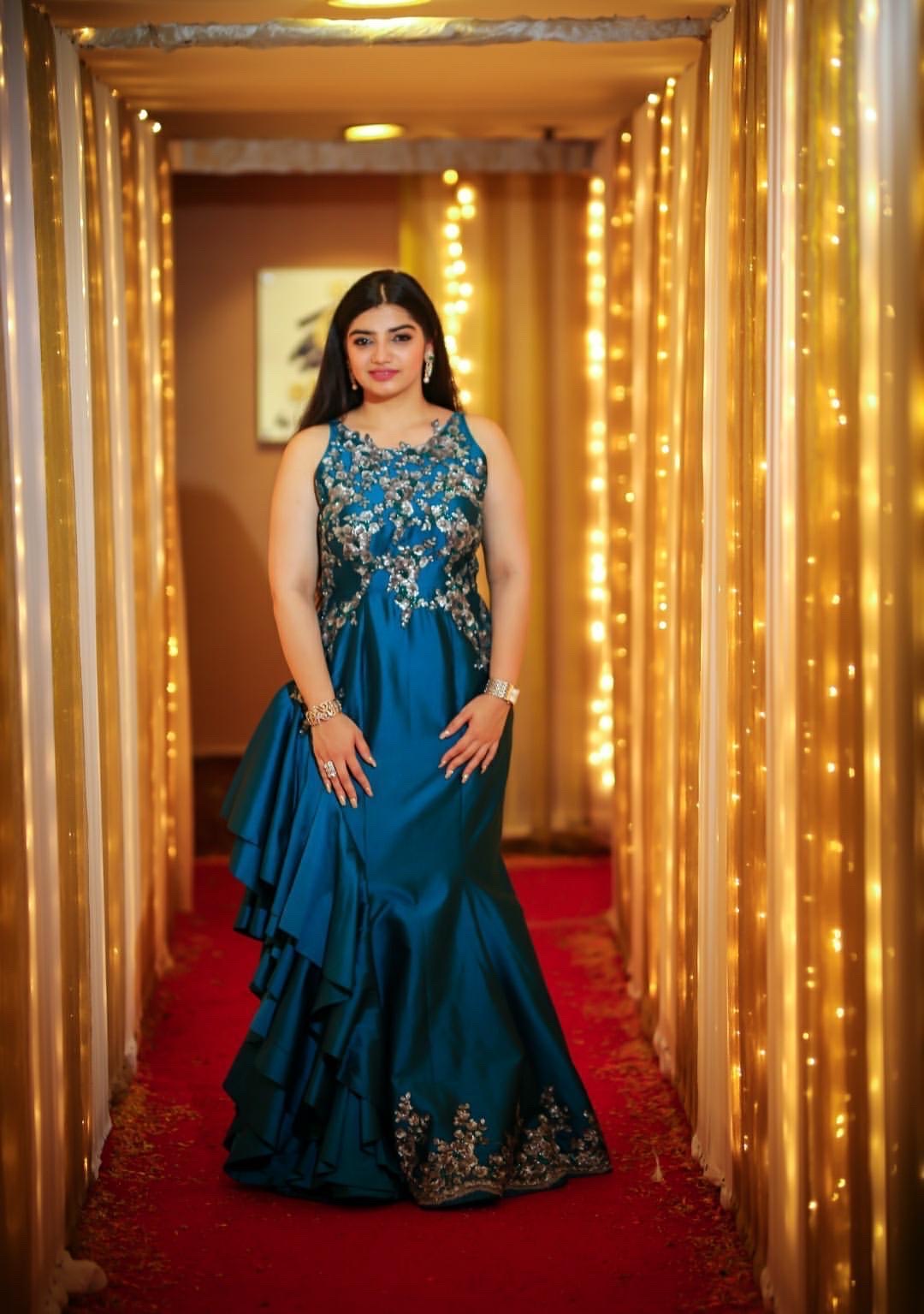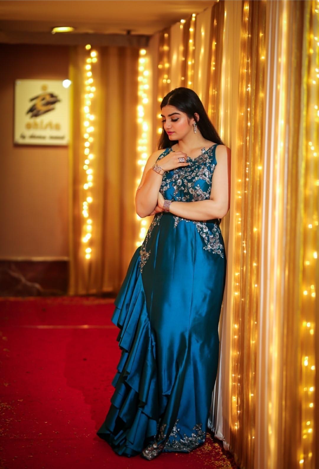 Our client was looking for a versatile and contemporary outfit for a friend's wedding reception. We created this lovely turquoise blue ruffle gown with scattered emebellished embroidery.