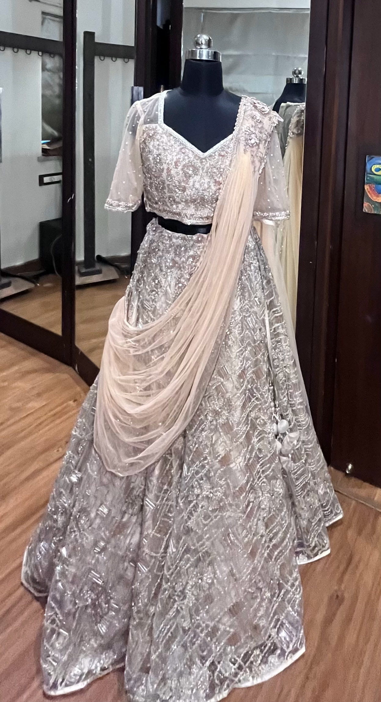 Our bride from the US, Hinali came to us after 5 years to transform her Jesal Vora champagne bridal gown. We completely revamped the look by creating a lehenga with a pre-stitched dupatta, which gave the illusion of a draped saree. We worked through the whole process virtually and shipped the transformed outfit to her doorstep.
