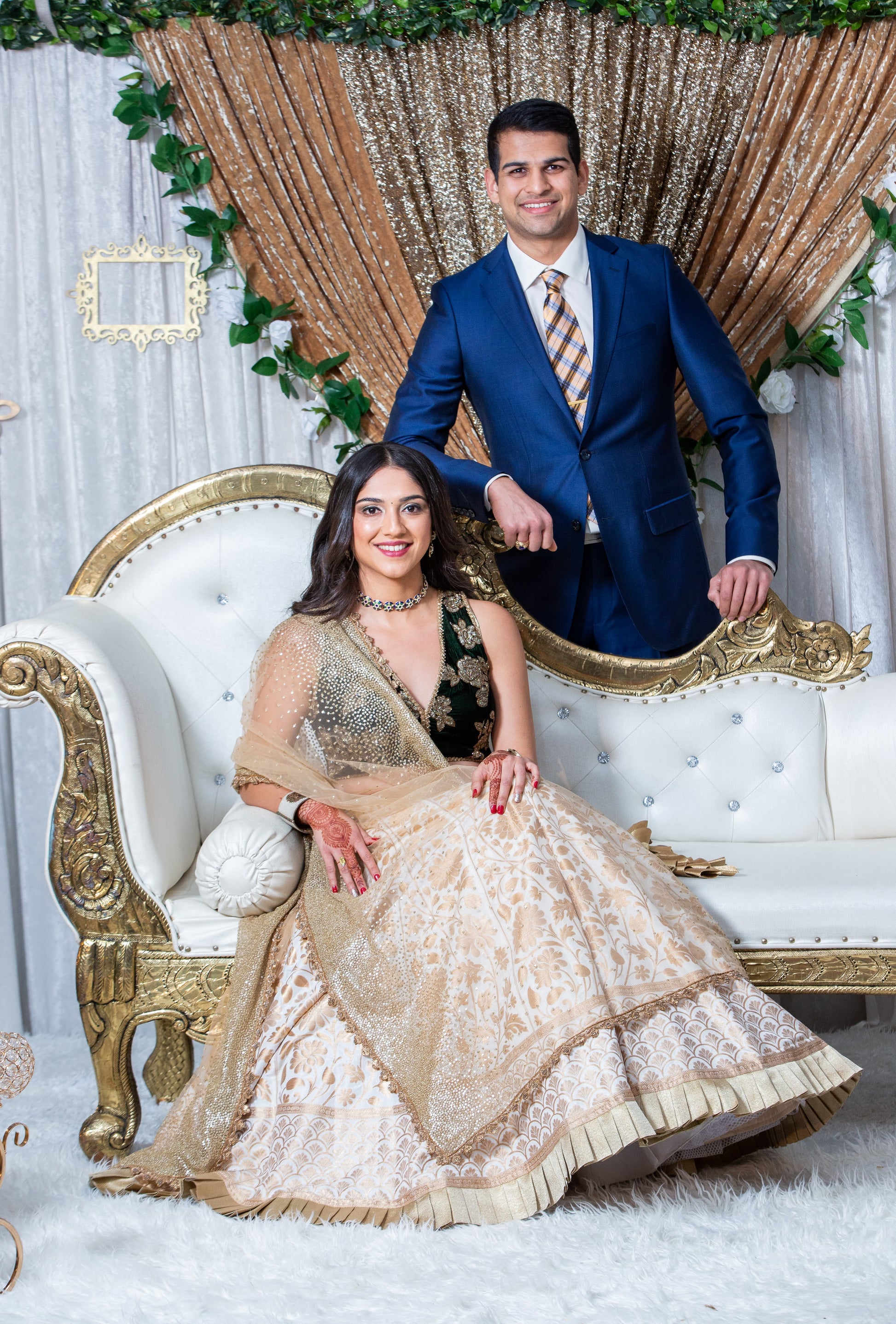 For her intimate roka ceremony, the bride desired a comfortable timeless outfit. We crafted a classic banarasi lehenga in off-white, paired with a contrasting velvet emerald green embroidered blouse and our Signature Jesal Vora dupatta. This ensemble perfectly suited the occasion.