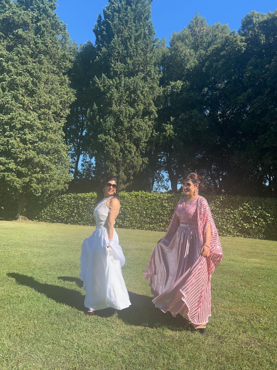 We created this stunning monochrome look for our client, with a hand-embellished blouse and a cape. We chose a shade of pink that perfectly reflected her personality and complemented her body and skin type.