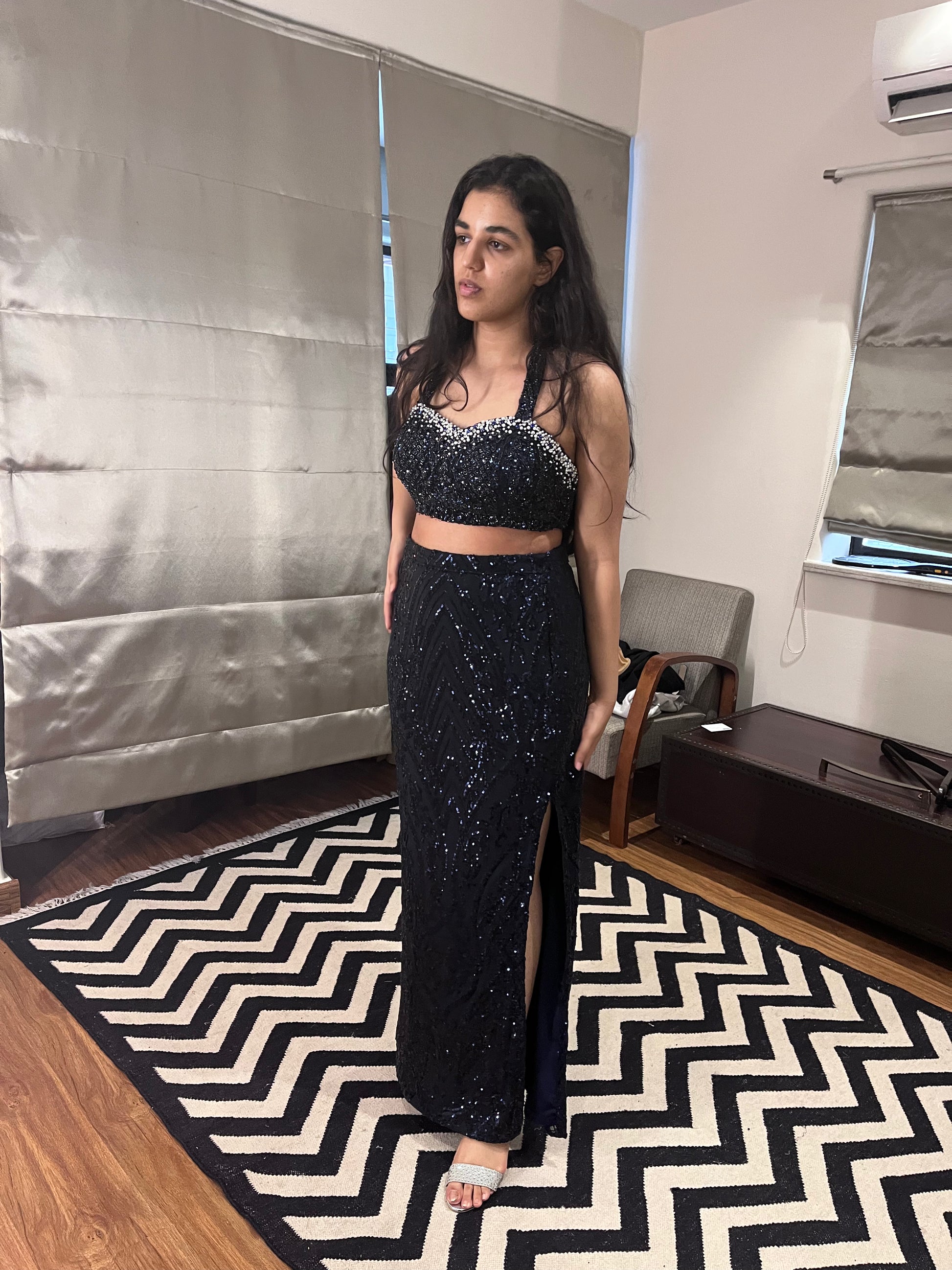 Our client wanted an elegant and graceful look for a formal reception being held in London that still remained age-appropriate. We curated this alluring, high-slitted skirt with a custom embellished blouse, with handembroidered stones, pearls and diamonds, keeping in mind her preferences and personality.