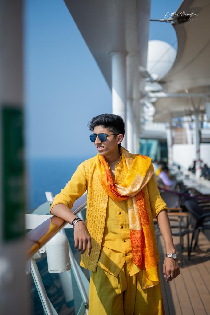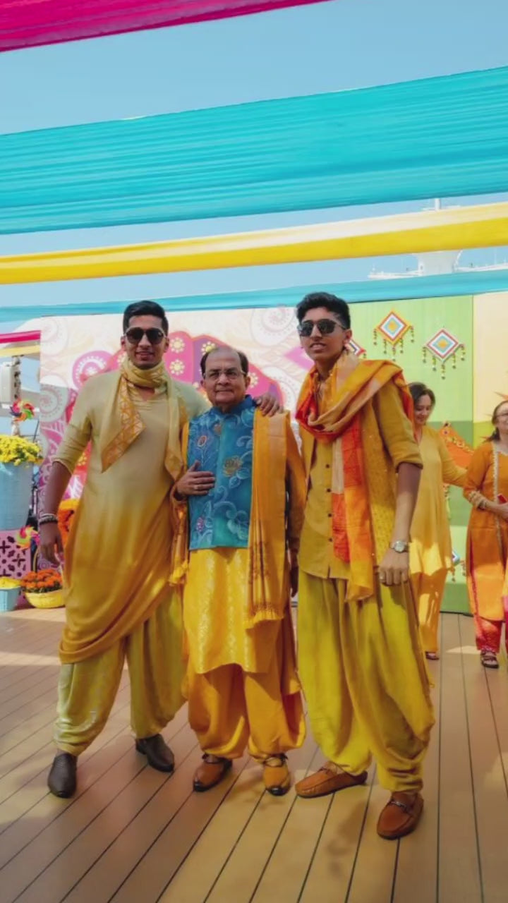 Our client came to us for his grandparents' 60th wedding anniversary. He wanted a versatile piece that he could re-wear. As per his body type, we gave him a three-layer ensemble with a pure khadi shirt, kurta, and dhoti pants with a phulkari dupatta. The ensemble added a burst of colour and elegance to their celebration.