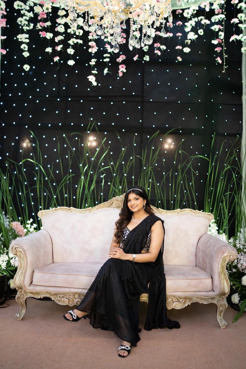 For the reception function, we crafted this beautiful black and silver pre-draped saree with a hand-embellished blouse for our client, giving her a contemporary and versatile look.
