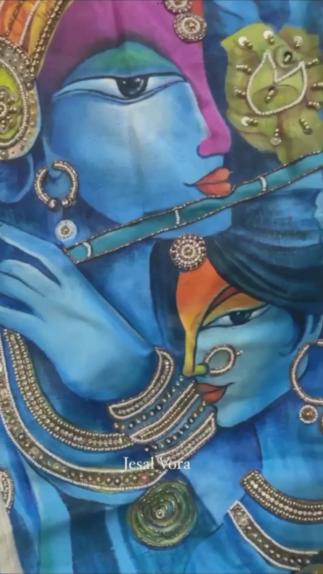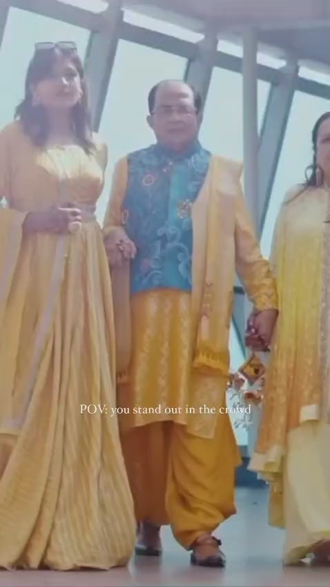 For our client's 60th wedding anniversary haldi ceremony, we tailored a stunning Banarasi kurta set, with a hand painted Krishna figurine jacket. This ensemble radiates vibrancy and elegance, commemorating their special milestone with style.