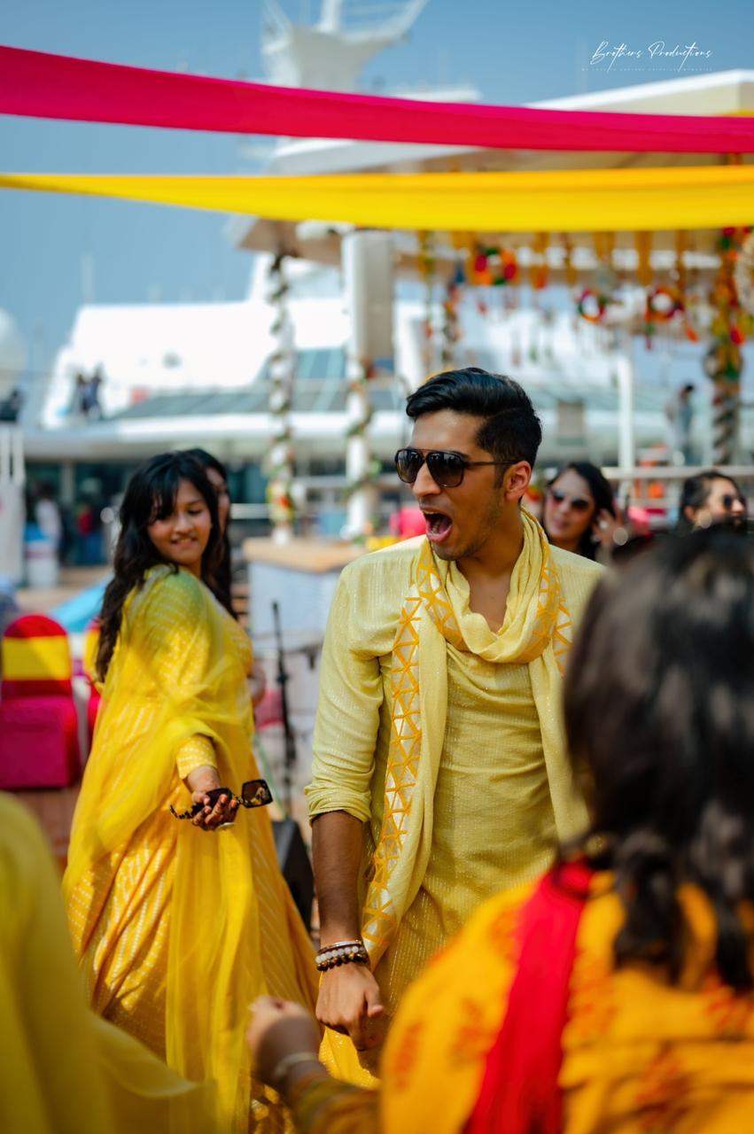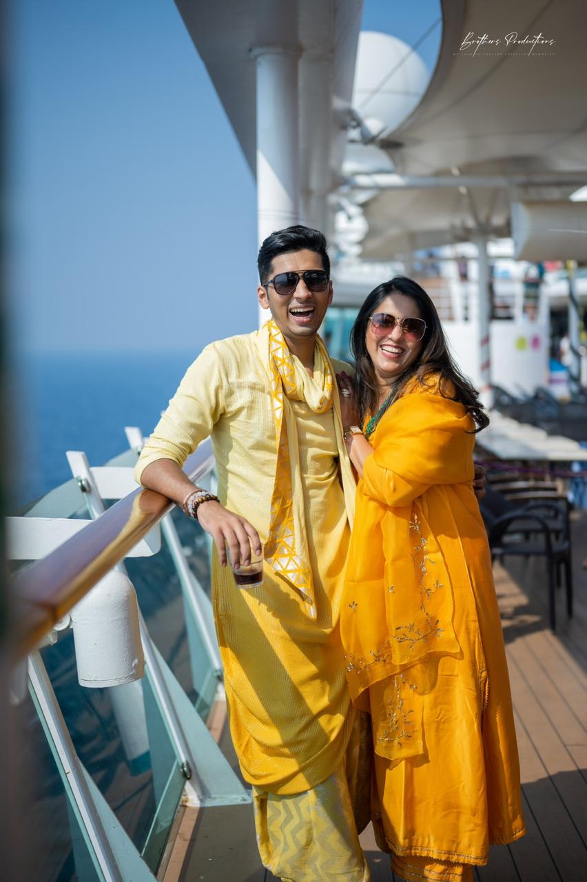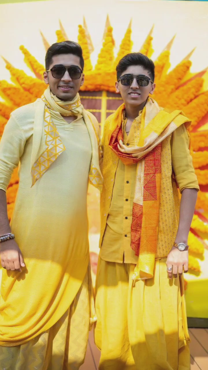 For his grandparents' 60th anniversary haldi ceremony, our client came to us with a specific request. He wanted a modern kurta set with a different cut to uplift his personality. We designed a yellow kurta with a traditional twist and added a striking cape, blending rich tradition with contemporary style for this cherished celebration.