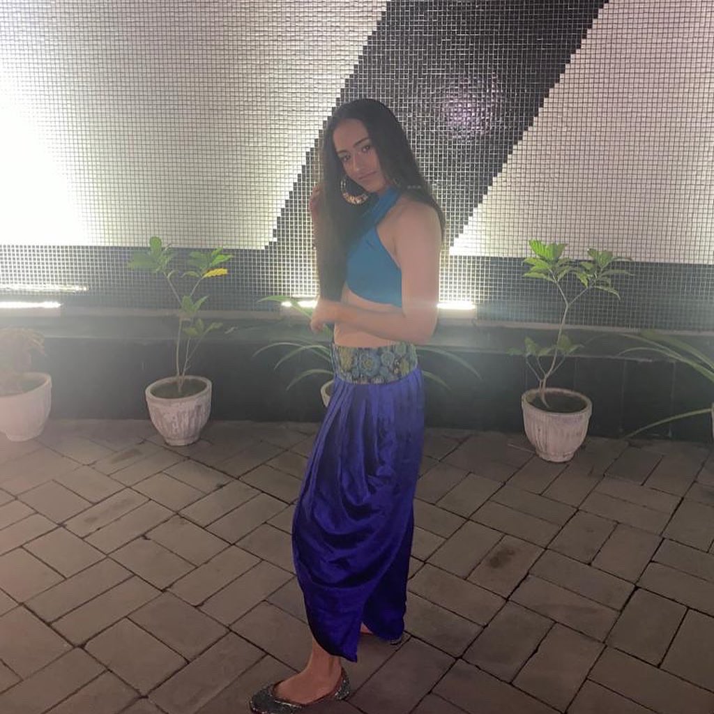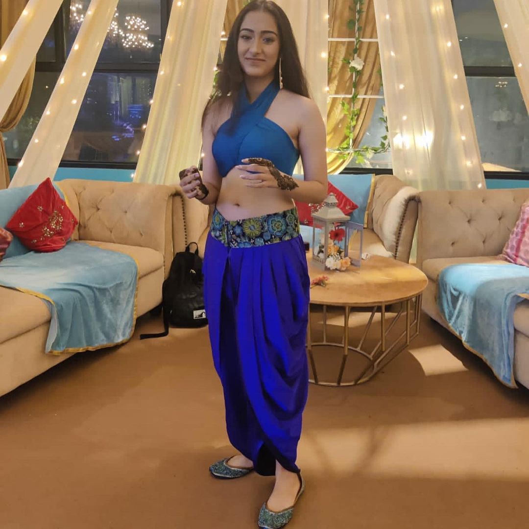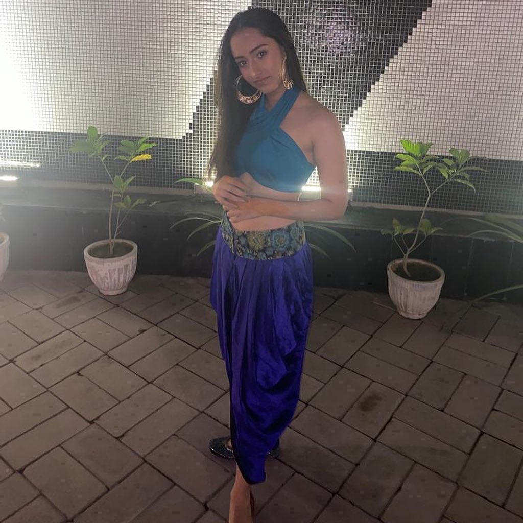 Our client came to us looking for a custom outfit for a family mehendi function. She wanted an outfit that drew inspiration from the character Jasmin from "Aladdin". Keeping that in mind, along with her persona, we crafted this gorgeous two-piece look in shades of blue with dhoti-patiala pants and a cross-backed, abstract blouse to match her preferences.