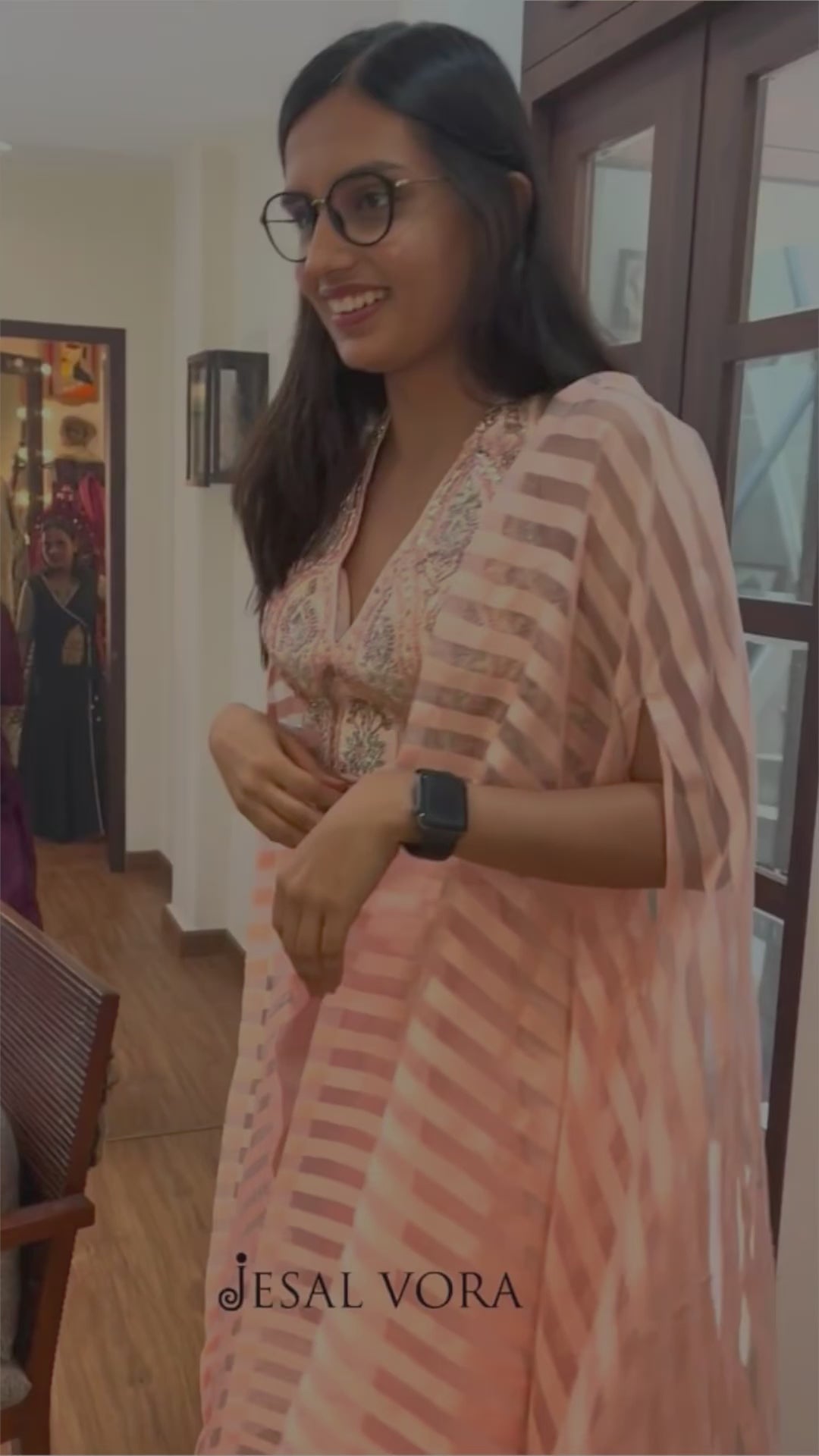 Our client wanted a contemporary look for a formal sit-down dinner and was looking for a versatile and contemporary look. We chose this blush pink shade to complement her skin tone and curated this look with a halter blouse and a draped skirt with a striped organza jacket. The look also featured resham zardozi handwork with floral and geometric embellishment.