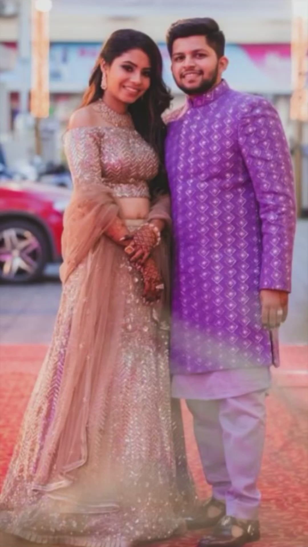 Our bride wanted a timeless and modern look for her reception. We created this stunning embellished off-shoulder lehenga in a classic champagne colour with Signature Jesal Vora chevron embroidery to bring a contemporary touch.