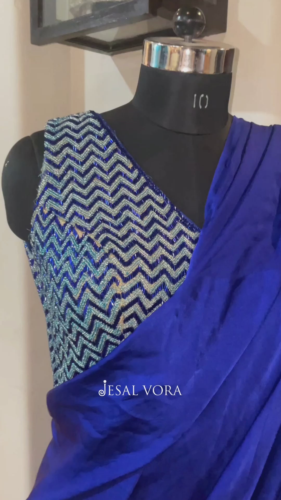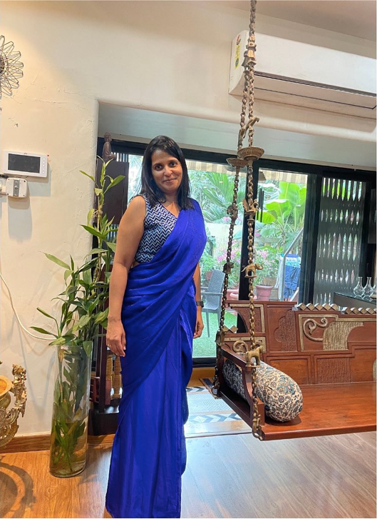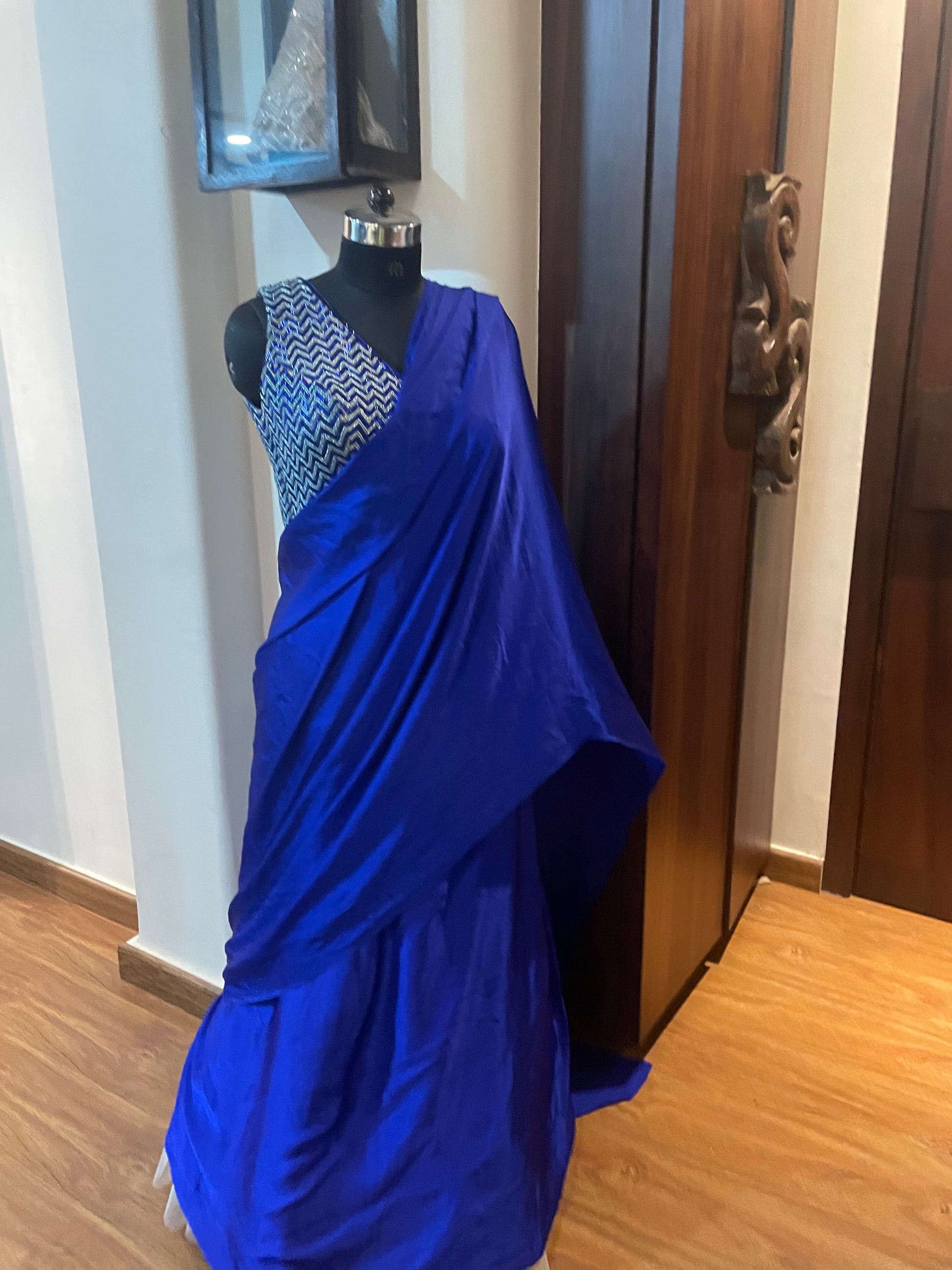 Our client wanted an outfit she could wear without much hassle for a family sangeet. We curated this beautiful satin pre-draped saree in a gorgeous shade of blue and uplifted the entire look with a handcrafted chevron blouse.