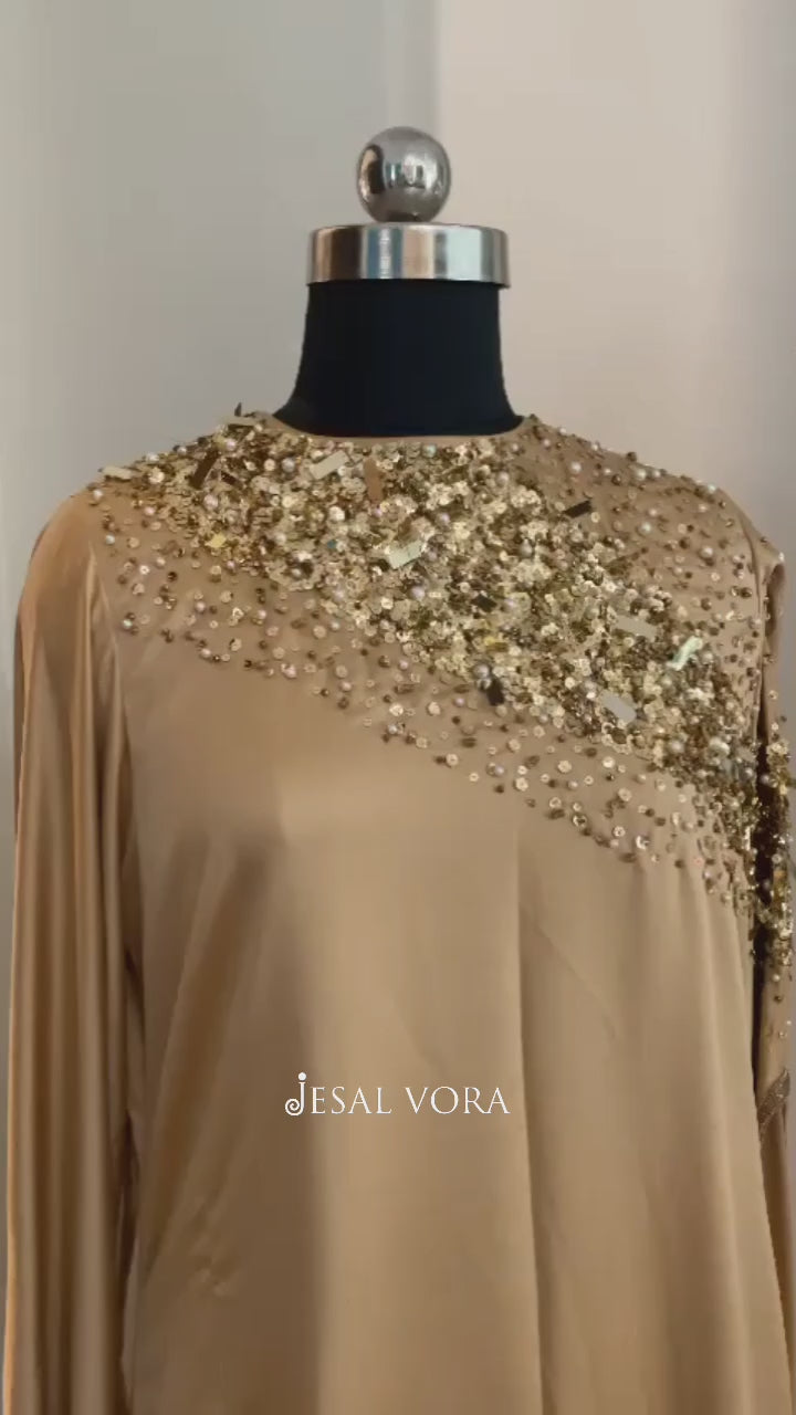 We curated an alluring gown for our client featuring sequins and embroidery on one side, maintaining a contemporary look with and element of glam.