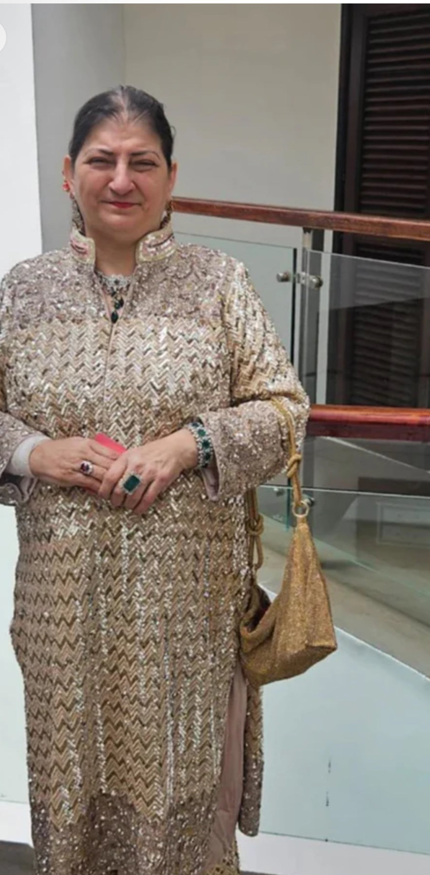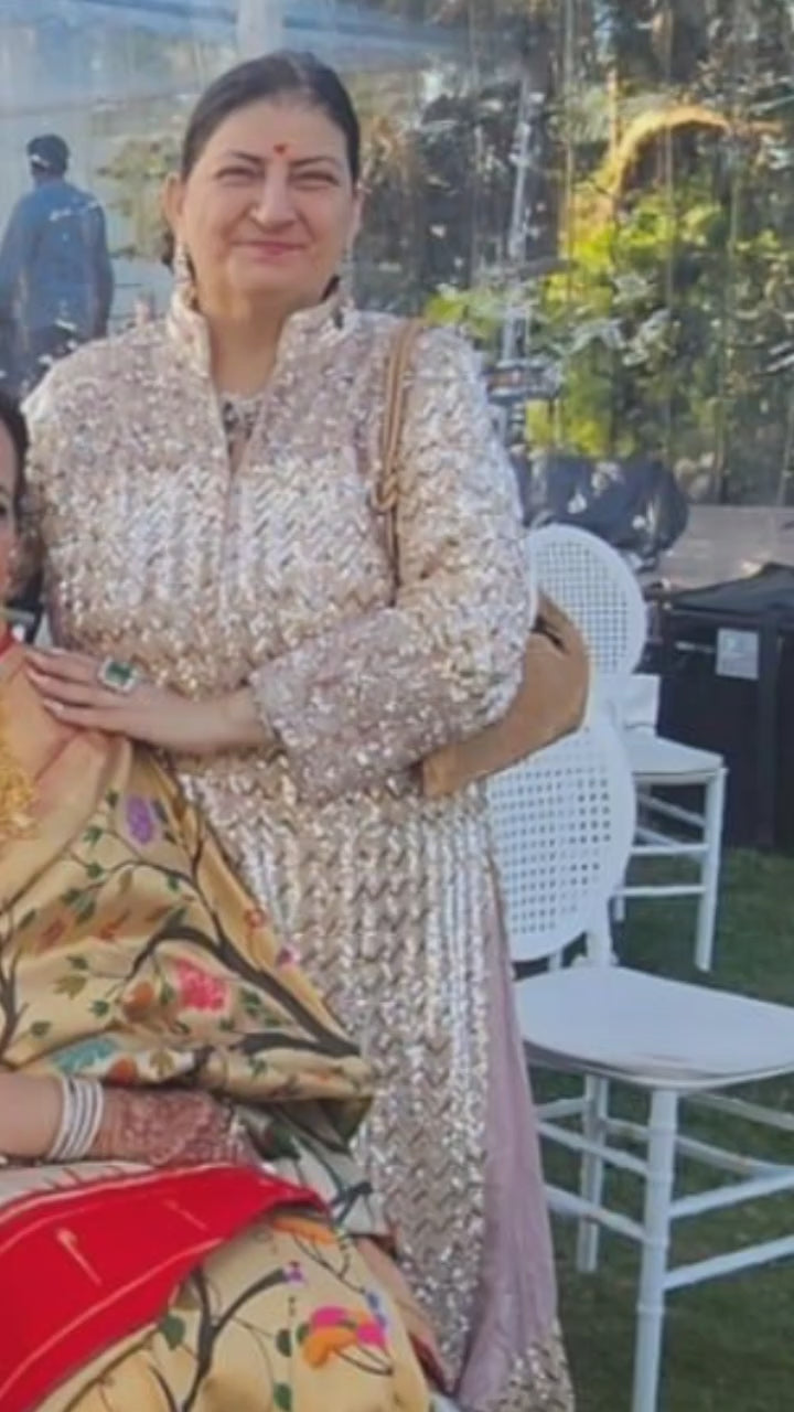 For a family wedding, our client wanted a comfortable outfit that matched her personality. Keeping that in mind, we designed this handcrafted chevron co-ord set, with over 30 hours of handwork to match her preferences and personality.